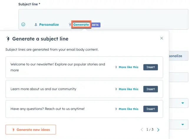 Example AI subject line generation functionality in Hubspot: